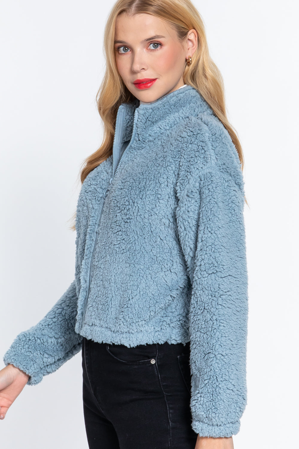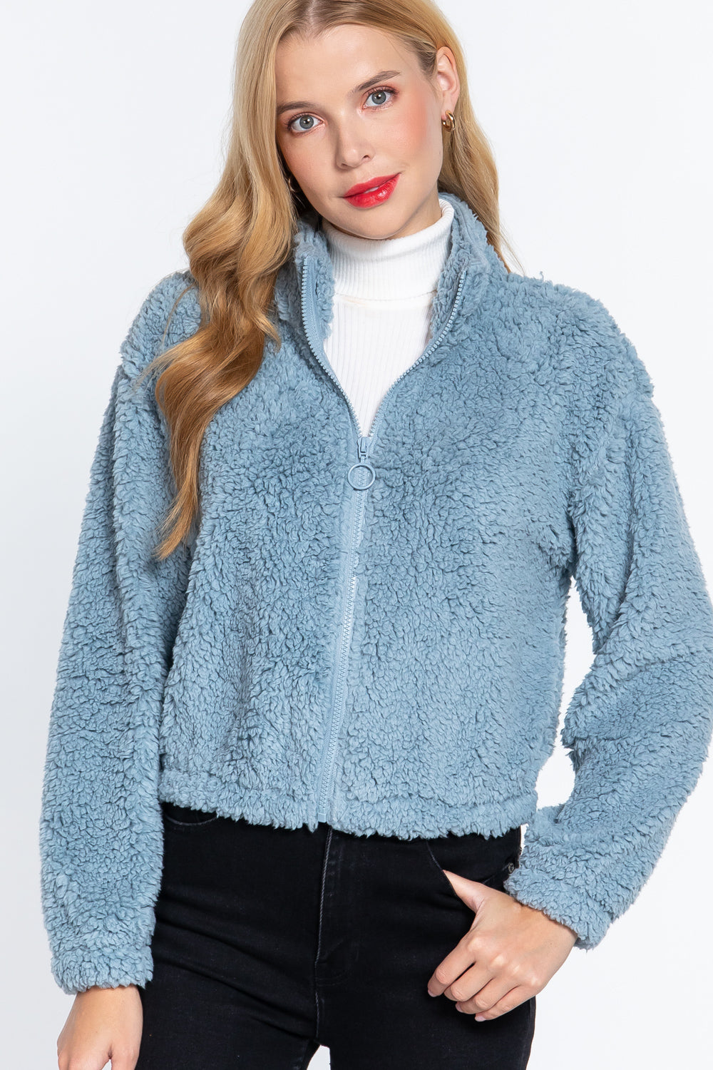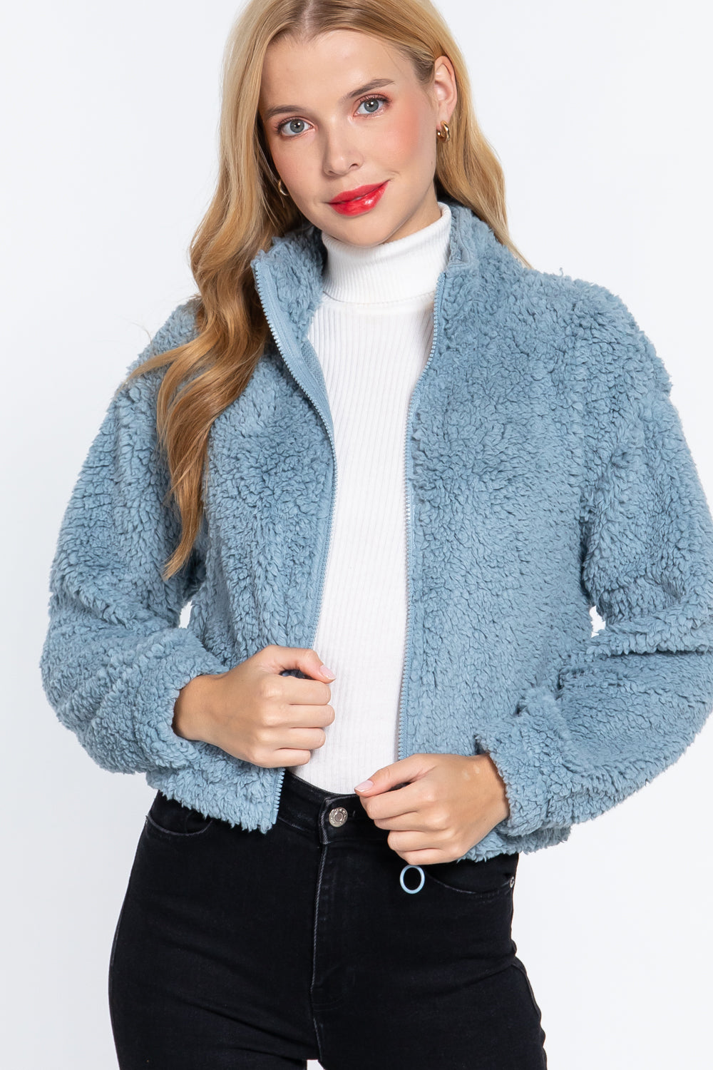 LONG SLEEVE MOCK NECK FAUX FUR ZIP-UP JACKET