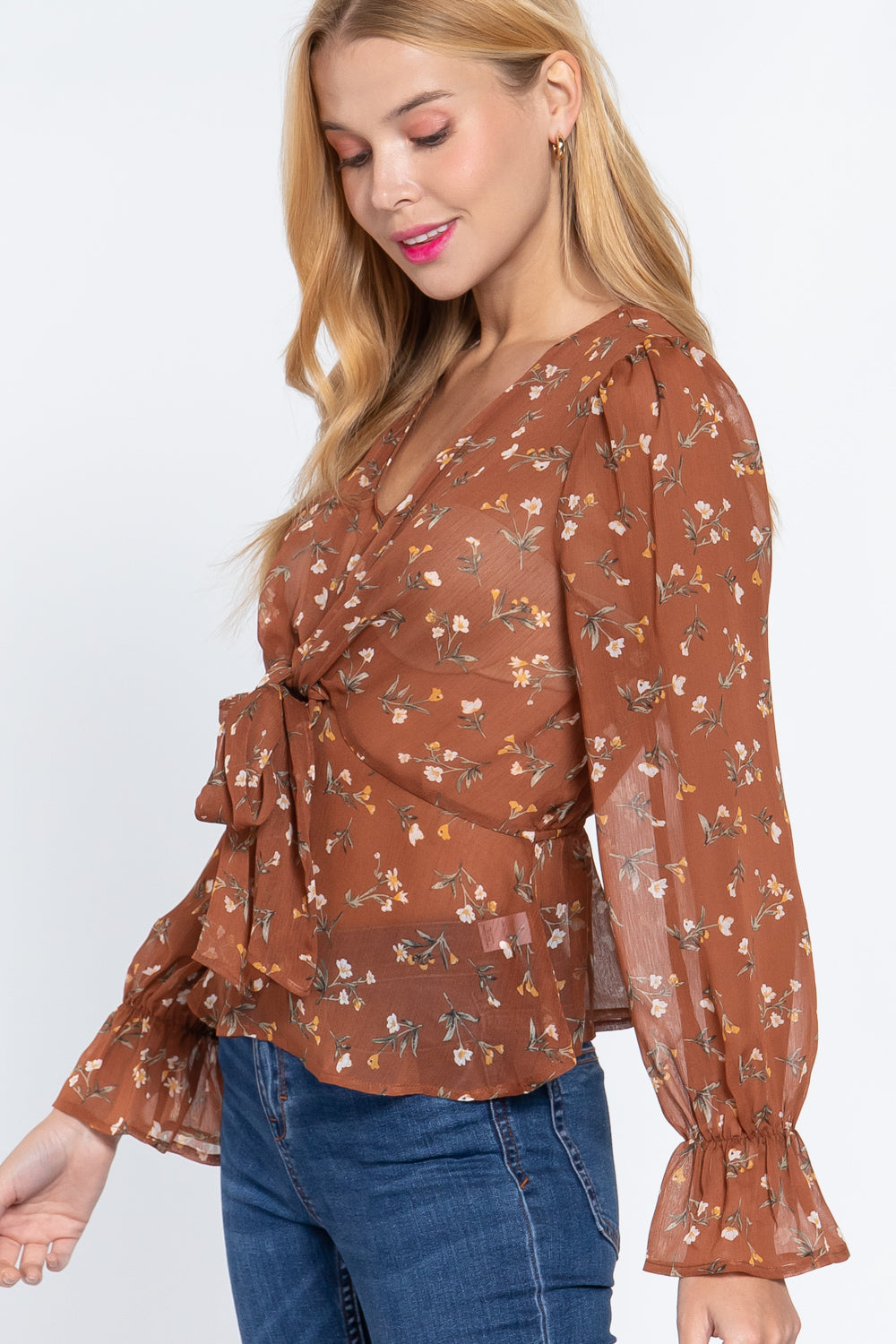Imported S.M.L ELBOW RUFFLE SLEEVE V-NECK w/TIE DETAIL PEPLUM FLORAL PRINT WOVEN TOP 100% Polyester Mocha/Mustard ACT
